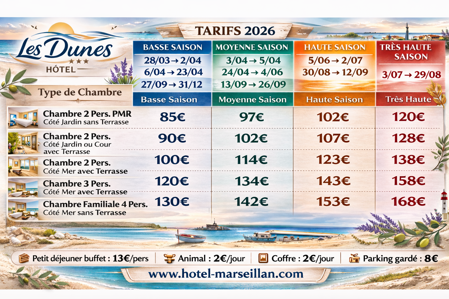 Nos tarifs sont nets TTC en euros, par chambre et par jour.